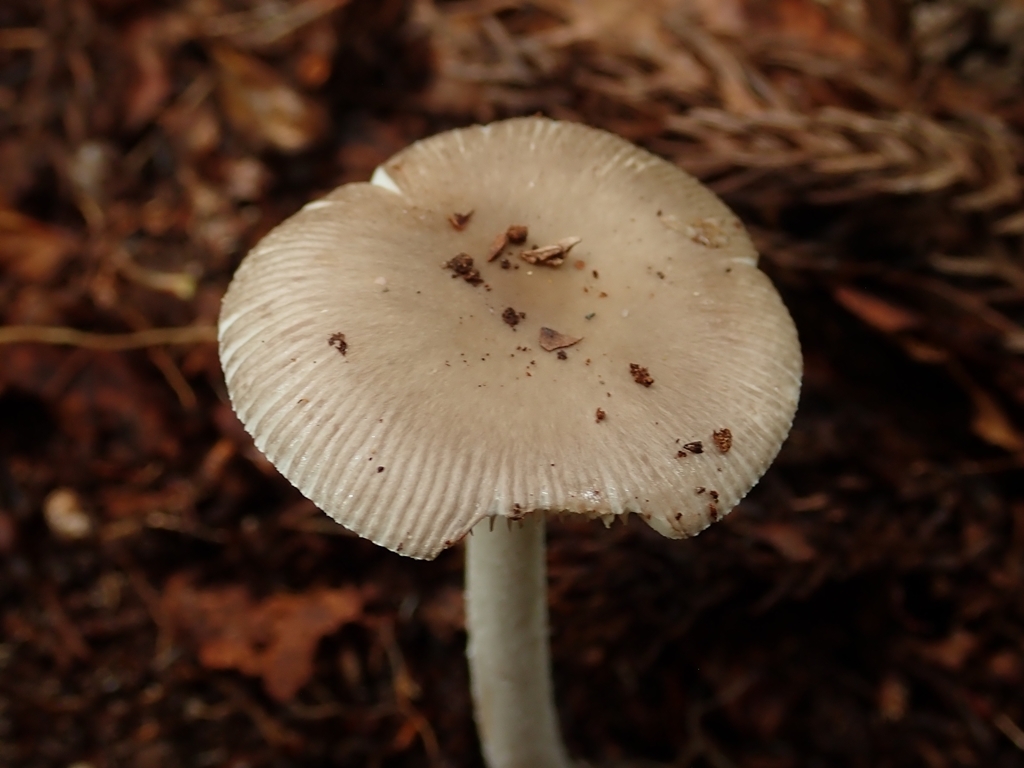 Descripción: Sombrero de tamaño medio, convexo a plano-convexo y finalmente extendido; cutícula lisa o finamente fibrilosa, de color gris, gris ceniza a gris plateado, a veces con matices pardo-grisáceos; margen claramente estriado (estrías radiales visibles, más marcadas con la madurez). Láminas blancas, apretadas a medianamente espaciadas, con lamélulas; generalmente libres o escasamente adnatas, con arista entera. Pie cilíndrico, blanco a blanquecino, a veces con tonos grises o fibrillas aplicadas; frágil, hueco o fistuloso con la edad; sin anillo (carácter constante). Base del pie con volva desarrollada, saciforme o envolvente, blanca a blanquecina, a veces algo grisácea o sucia, con bordes irregulares; bulbo no marcado, predominando la envoltura volvar. Carne blanca, poco cambiante al corte; olor suave o poco perceptible y sabor no característico. Esporada blanca. Microscopia orientativa: esporas hialinas, lisas, elipsoidales a ovoides; basidios tetraspóricos; ausencia de cistidios llamativos; reacción amiloide variable según criterios de autores en el grupo Vaginatae, por lo que conviene apoyarse en conjunto macro y micro.