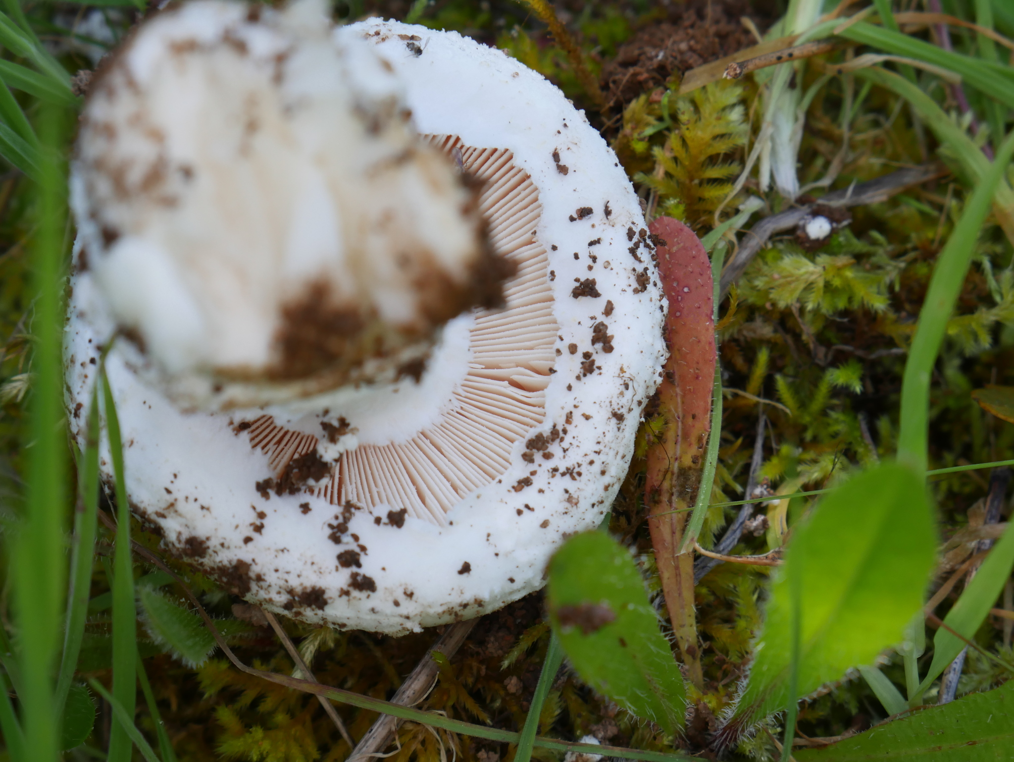 Sombrero de 6 a 15 cm (a veces mayor), convexo a plano-convexo, superficie lisa a algo mate, blanquecina a crema u ocrácea, a veces con manchas terrosas por emerger semienterrada; margen inicialmente enrollado. Láminas libres a sublibres, blancas, relativamente apretadas. Pie de 6 a 12 cm por 1.5 a 3.5 cm, robusto, blanquecino, macizo; sin anillo persistente (puede presentar restos de velo muy fugaces). Volva grande, gruesa y de aspecto fieltroso o membranoso en la base, inicialmente blanca y tendiendo a ocrácea o parda con la edad. Carne blanca, firme; olor marcado a tierra húmeda; al roce o corte puede mostrar tonos rosados a rojizos en algunos ejemplares. Esporada blanca; esporas elipsoidales, lisas e inamiloides, aprox. 8 a 12 × 5 a 7 µm (rango variable).