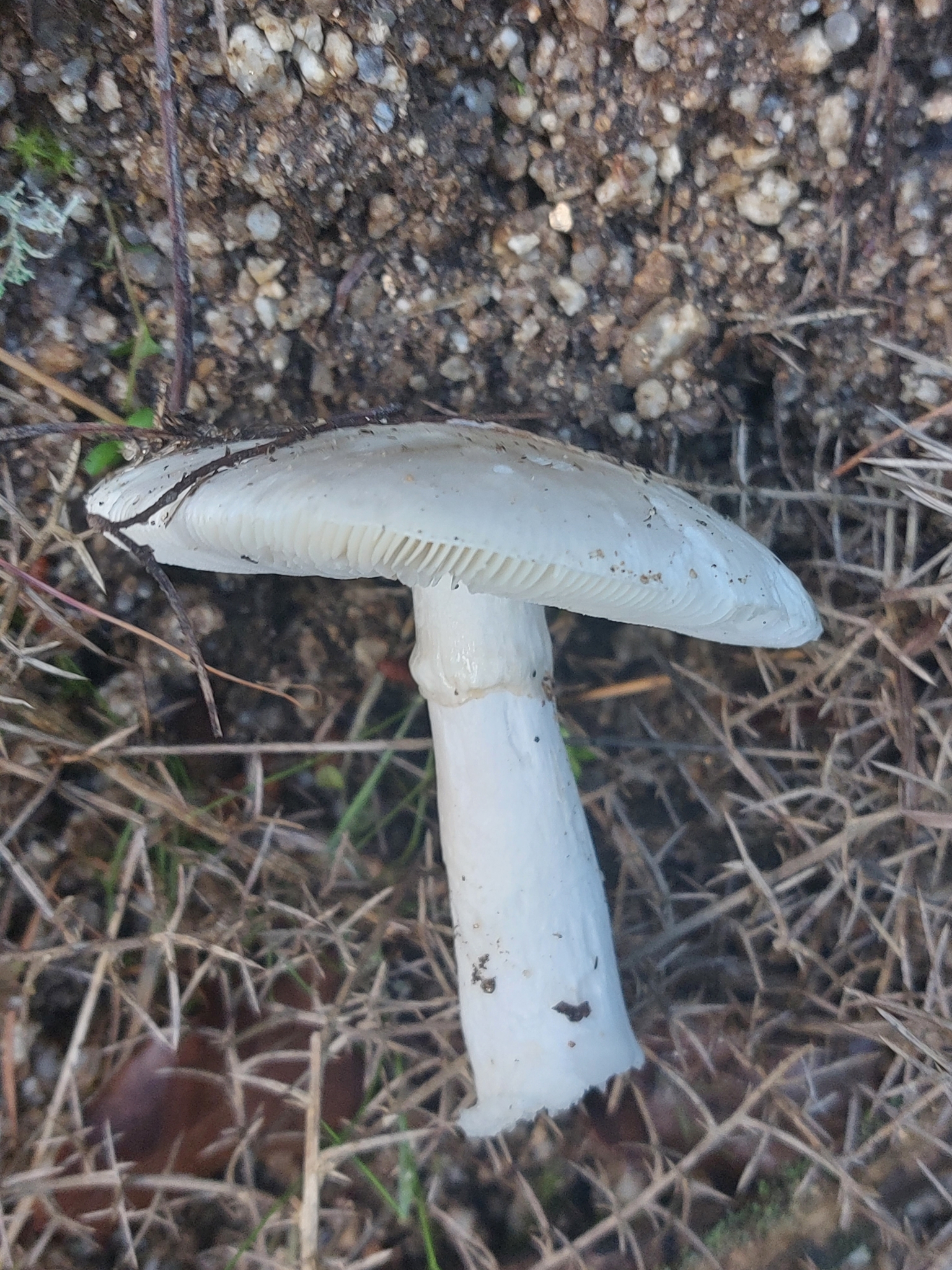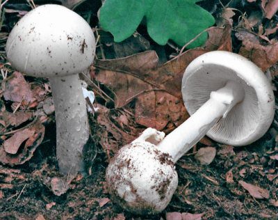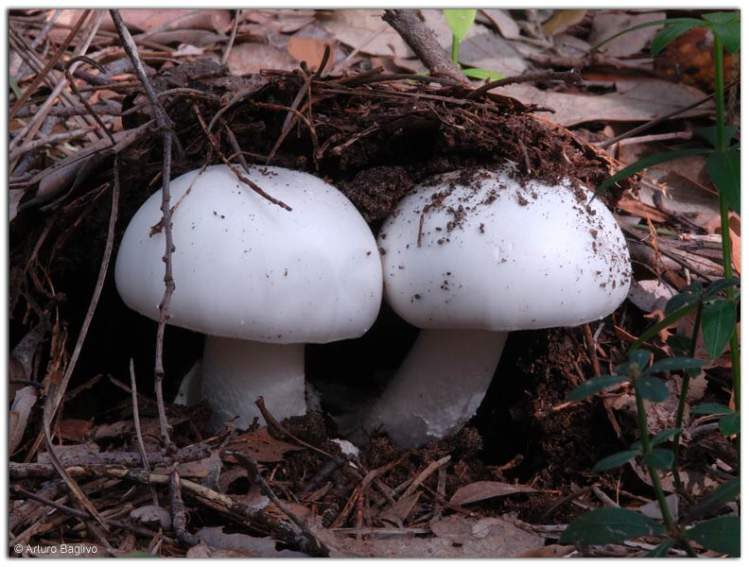 - Señales: basidioma completamente blanco, con anillo y base bulbosa.