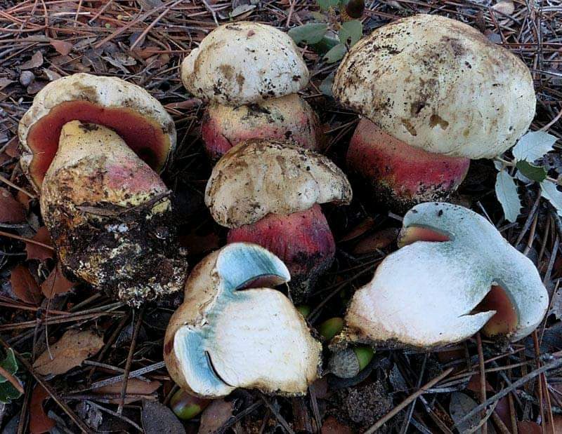- Claves rápidas: sombrero blanquecino + poros rojos + pie ventrudo reticulado.