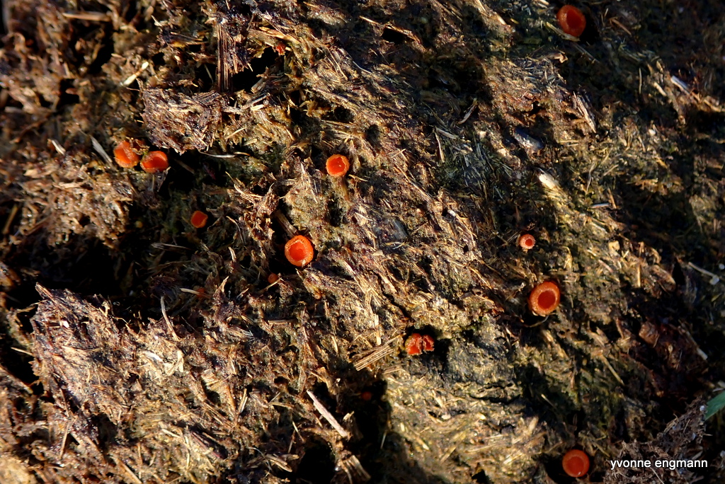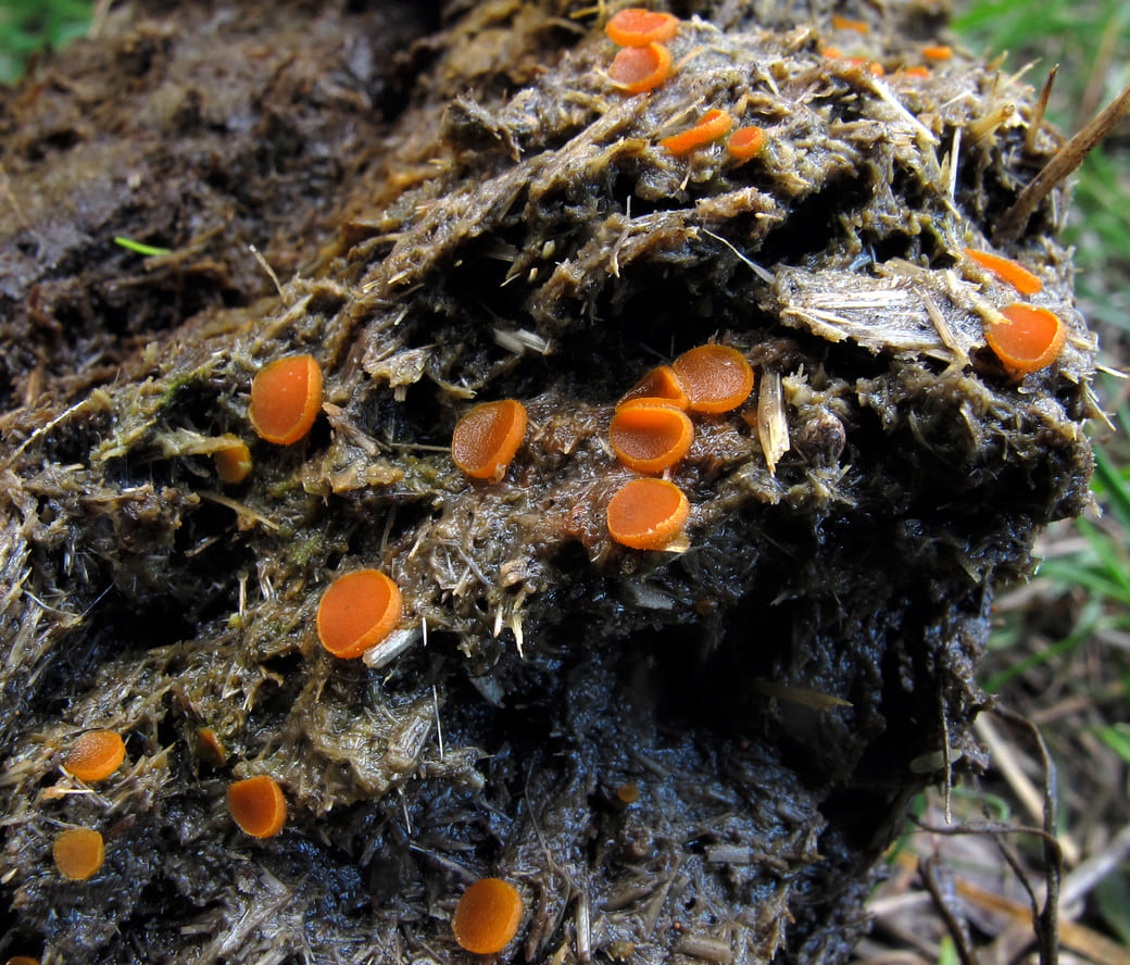 - Apotecios diminutos naranja, tipo disco, sobre estiércol.