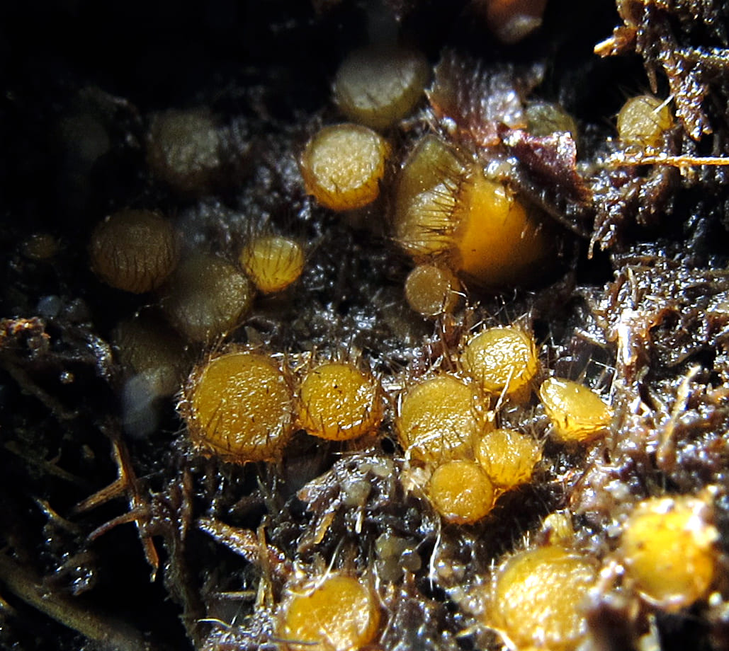 - Apotecios diminutos, anaranjados, en forma de copa aplanada.