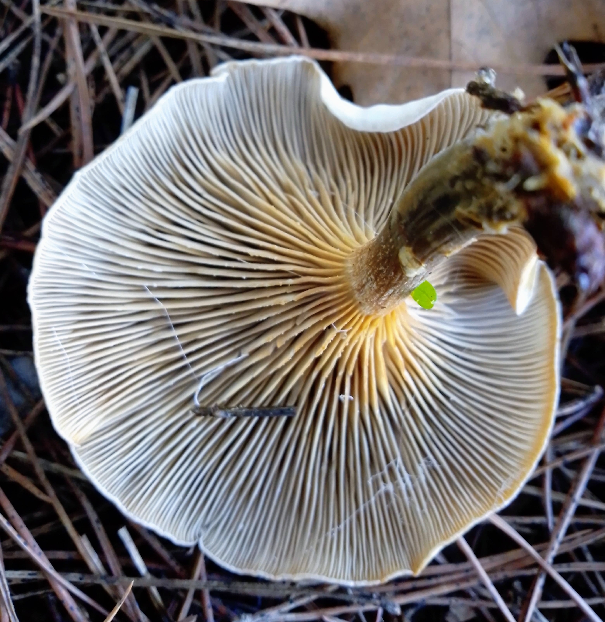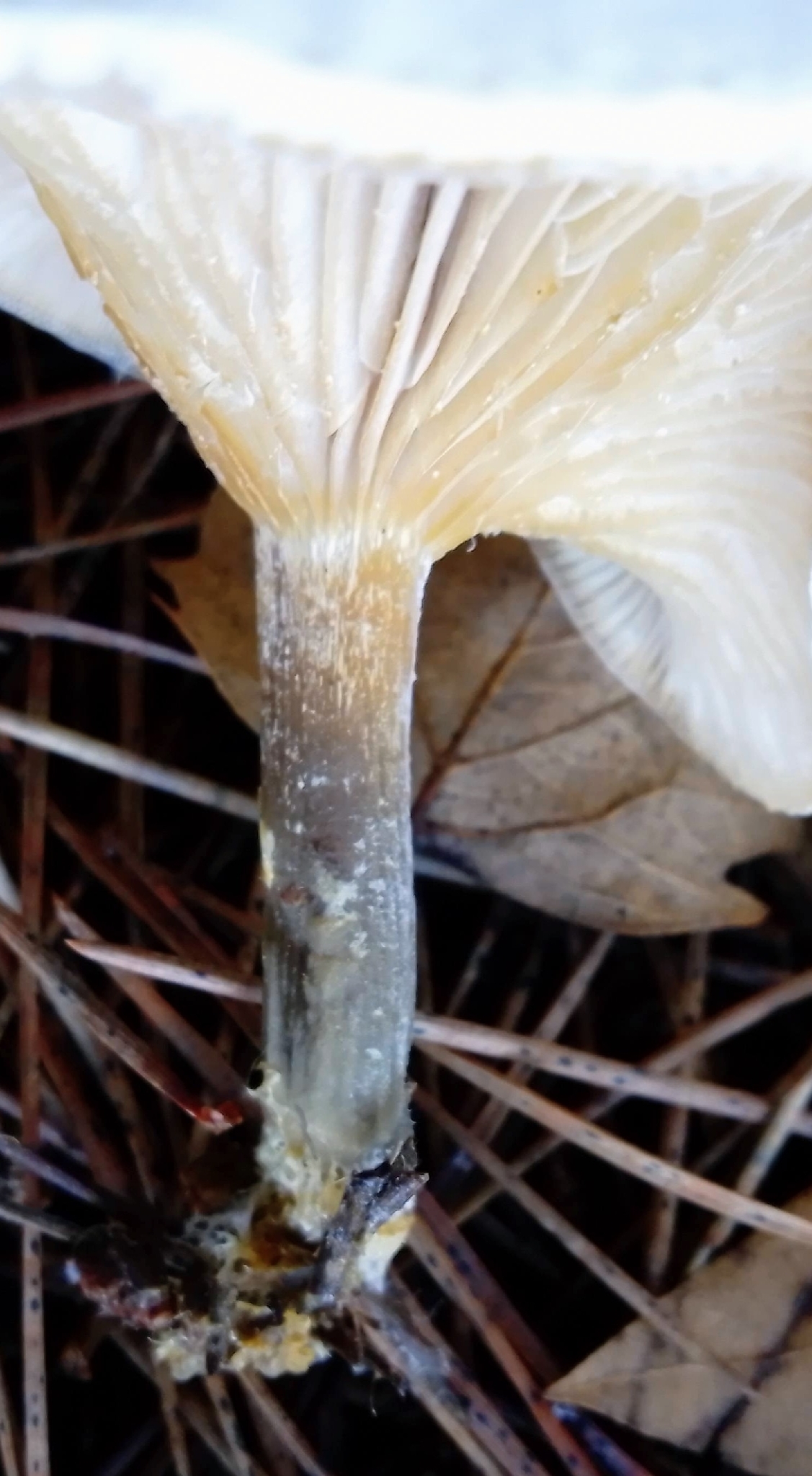 Método de identificación: Identificar por hábitat en lechos de acículas y mantillo de coníferas, tamaño pequeño, sombrero higrófano pardo-gris, láminas apretadas y decurrentes, y esporada blanca. Diferenciar de otras clitocibes pequeñas comparando color, olor y densidad de láminas; la confirmación a especie puede requerir microscopía y claves. Ante duda, no consumir.
