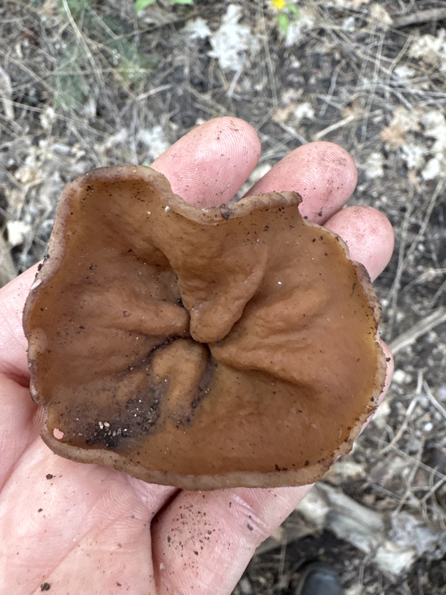Descripción: Apotecio de 2 a 10 cm (a veces mayor), primero en forma de copa poco profunda y luego expandido en disco irregular, muy plegado, lobulado y ondulado; margen a menudo enrollado o deformado, a veces pegado al sustrato en puntos. Superficie himenial (interna o superior) lisa a finamente arrugada, de color pardo rojizo, castaño a pardo oscuro, pudiendo palidecer en seco. Superficie externa (estéril) más pálida, ocrácea a pardo clara, a veces finamente tomentosa o granulosa. Pie ausente o muy corto y excéntrico, oculto por el pliegue del apotecio; inserción frecuente sobre madera enterrada. Carne frágil a elástica, delgada en el margen y más gruesa en pliegues, pálida a ocrácea; olor y sabor suaves o poco marcados. Microscopia: ascas cilíndricas de 8 esporas; esporas elipsoides a subfusiformes, lisas, hialinas, a menudo con gotas lipídicas, aprox. 22-30 x 12-16 µm; paráfisis filiformes a claviformes con pigmento pardo en el extremo en algunos ejemplares.