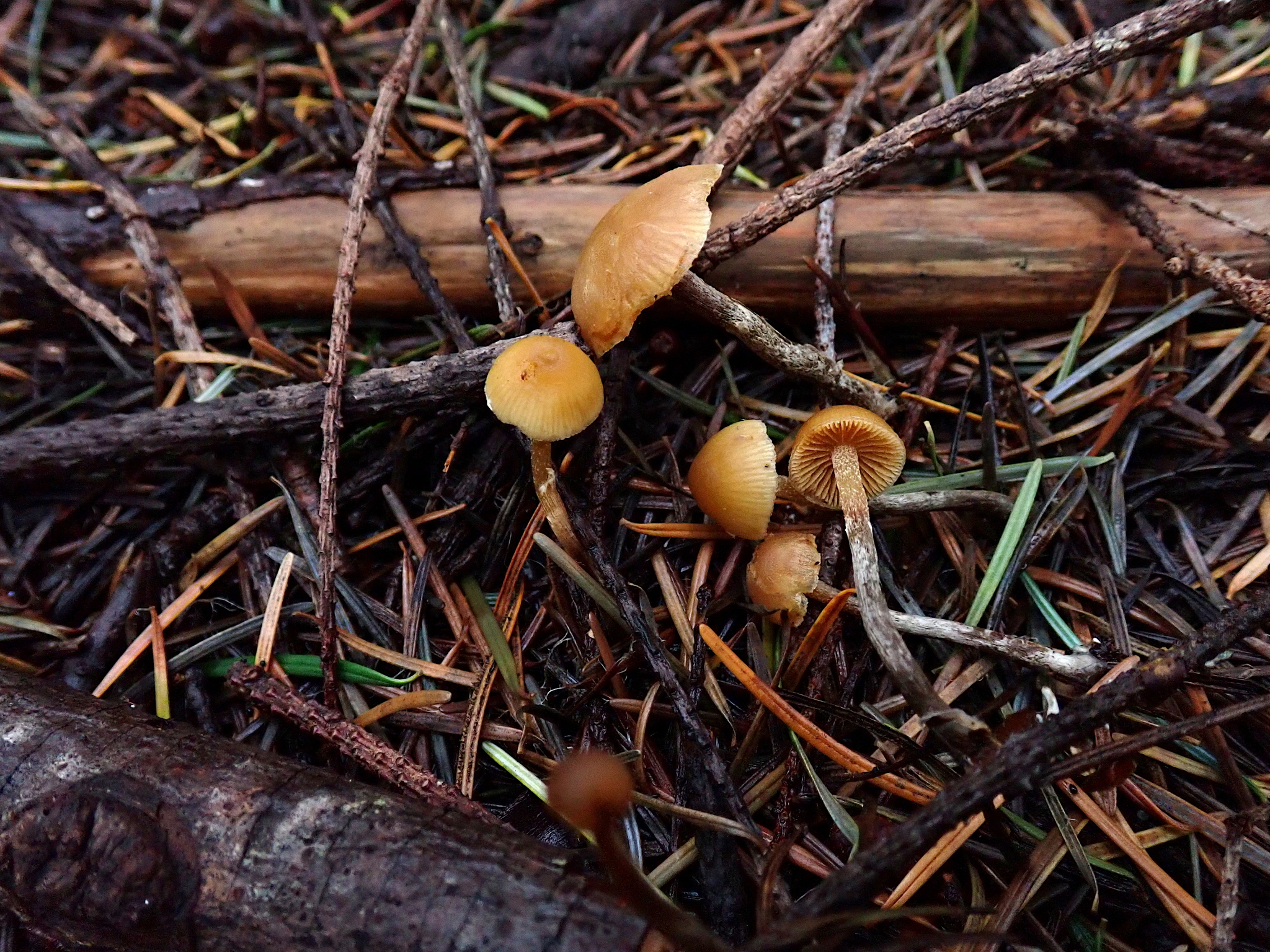 Busca pequeños sombrerillos ocres en grupos dispersos sobre madera degradada o suelos con musgo. Un buen indicio es la presencia de láminas que se vuelven ocre-pardas y la esporada de tono herrumbroso. Fotografiar el sustrato exacto es clave para la determinación.