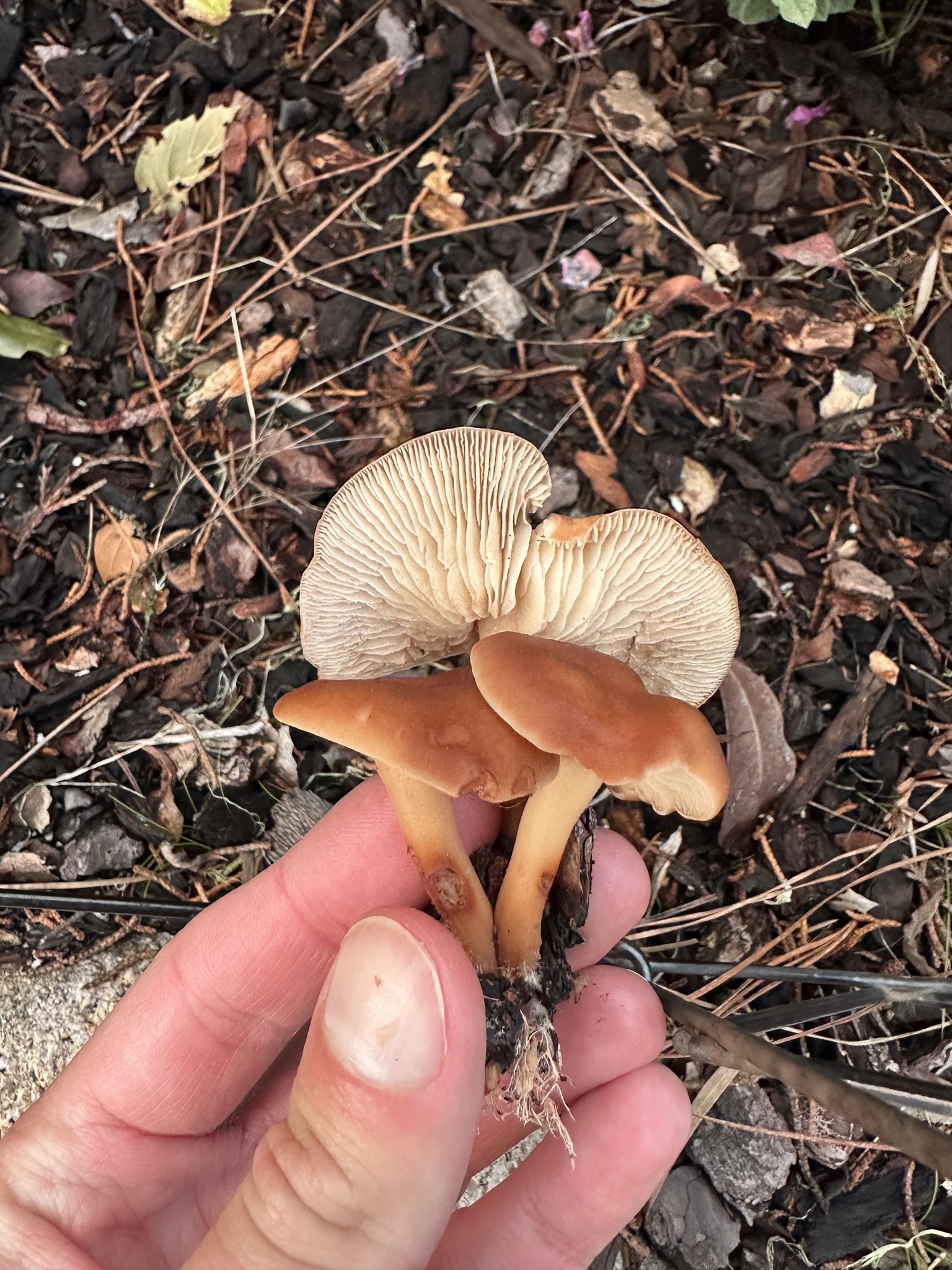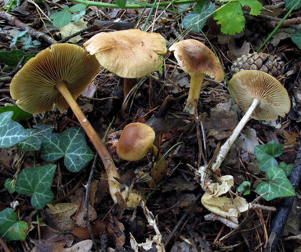 Busca colonias o grupos dispersos en la capa de hojas y agujas, a veces formando pequeñas alineaciones. El sombrero suele oscurecerse con la humedad y aclarar al secar, por lo que conviene observar varios ejemplares. Para confirmar, revisa el pie fibroso y la esporada blanca.