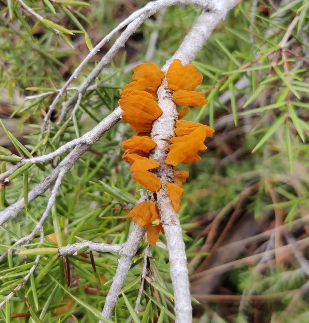 Hábitat: Parásito sobre ramillas y tejidos vivos de enebro y otras especies de Juniperus; frecuente en matorral, setos y jardines, con aparicion favorecida por humedad ambiental y lluvias.