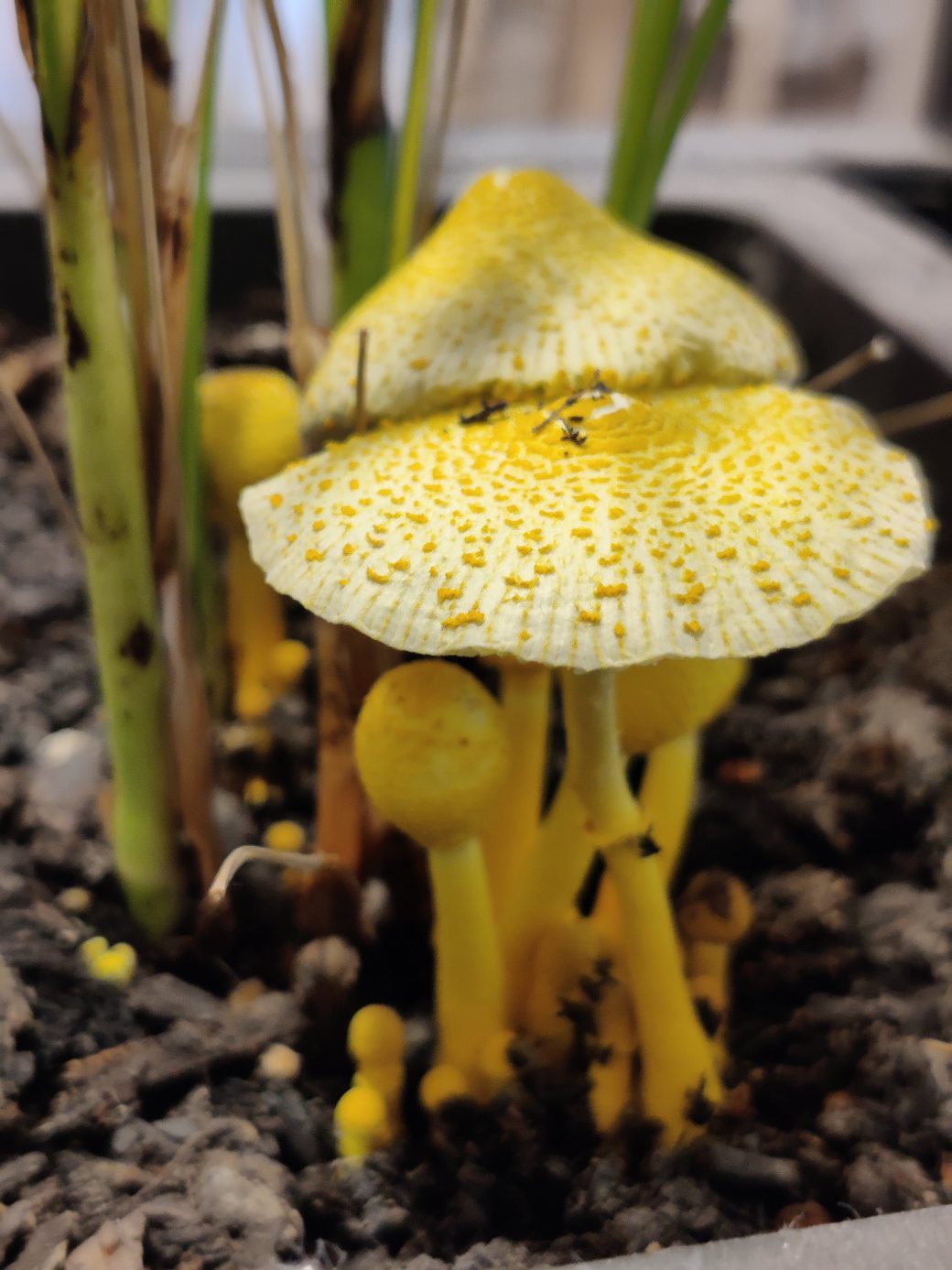 Suele delatarse por el color amarillo intenso. Aparece tras varios dias de humedad alta, riegos frecuentes o cambios de temperatura. Revisa la superficie del sustrato y los bordes de la maceta, donde la materia organica se acumula y la humedad se mantiene.