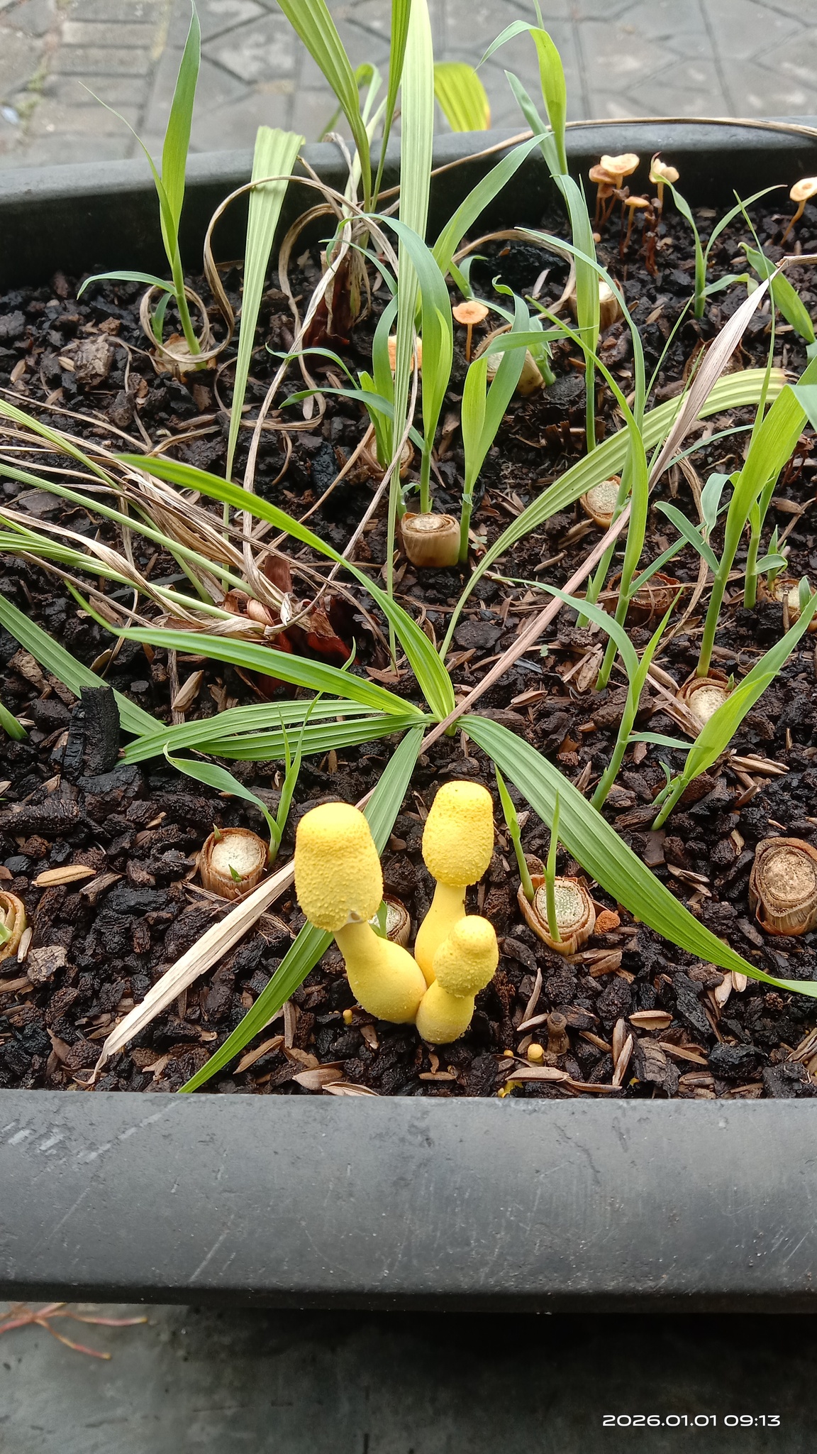 Leucocoprinus birnbaumii es una seta pequena a mediana, muy llamativa por su color amarillo limon, frecuente en macetas y sustratos de interior. Es saprotrofa, descompone materia organica del sustrato y suele aparecer en grupos tras riegos abundantes y calor.
