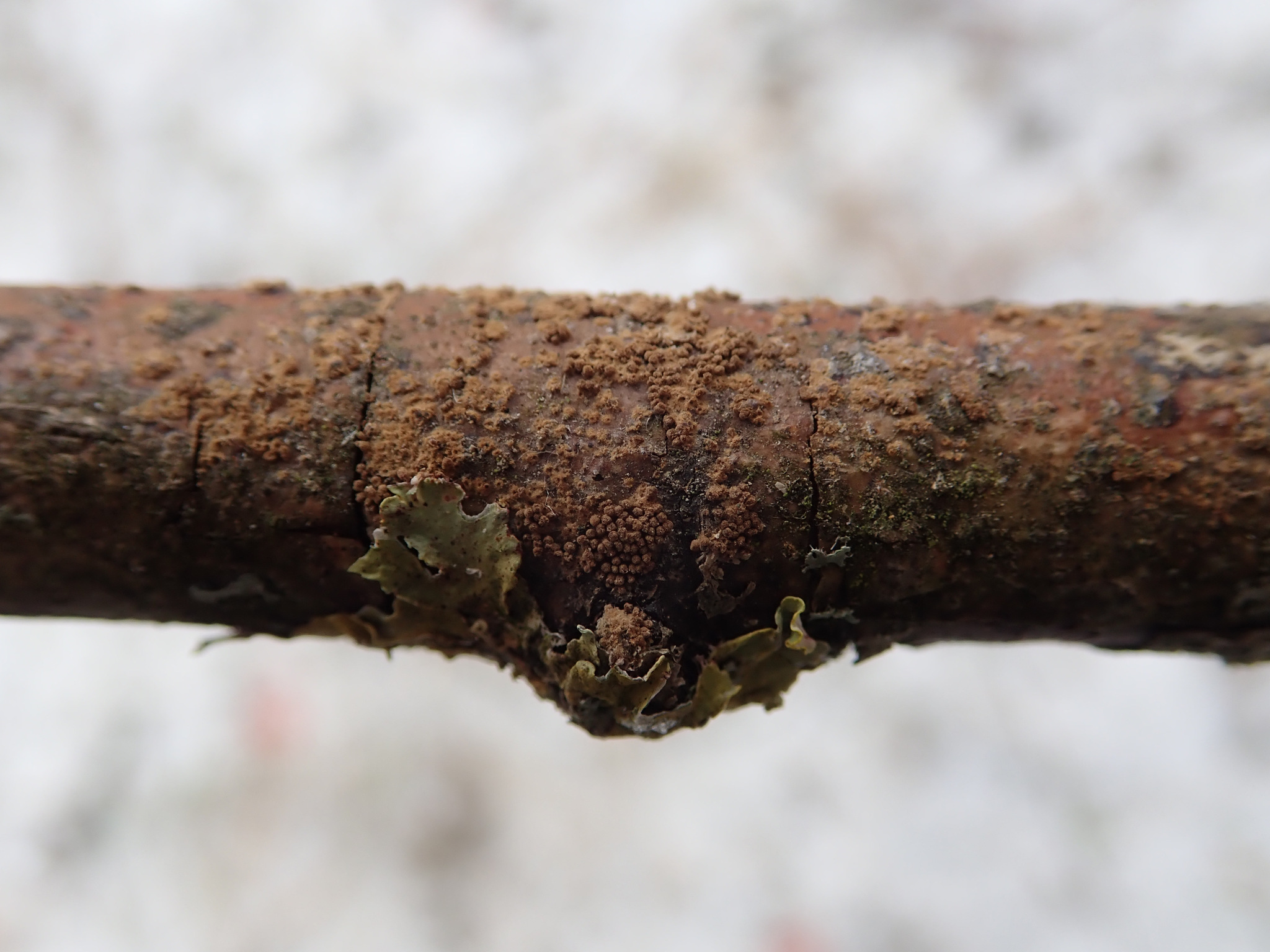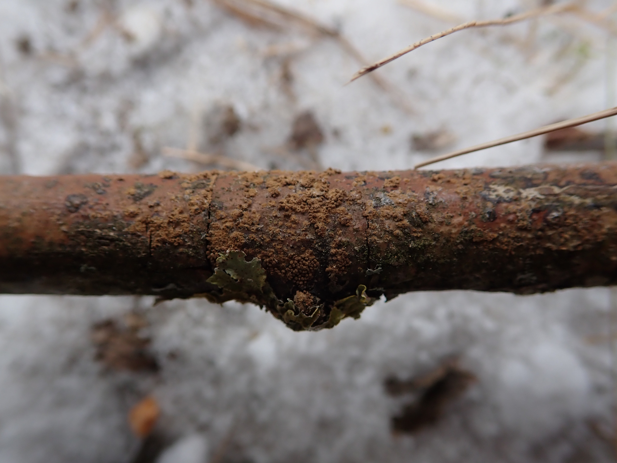 Fructifica sobre ramas finas, corteza, palitos y madera en descomposicion, a menudo en zonas sombreadas y humedas, tanto en bosques como en setos y parques. Puede observarse en periodos humedos desde otono hasta primavera, con apariciones puntuales tras lluvias.