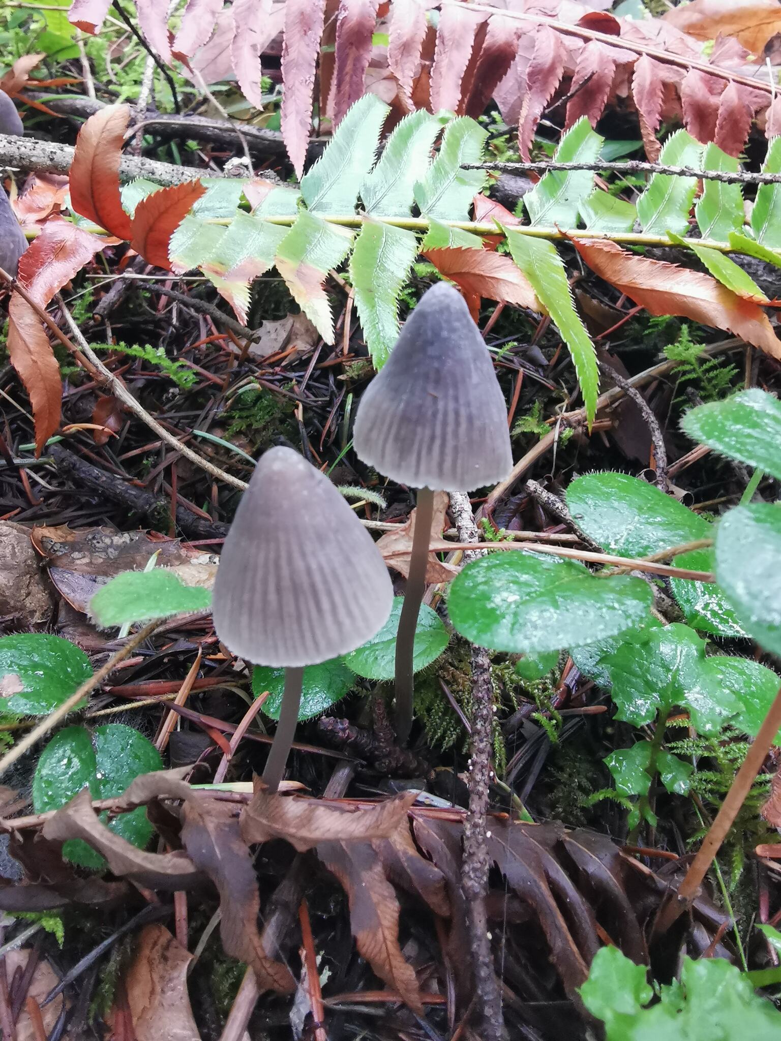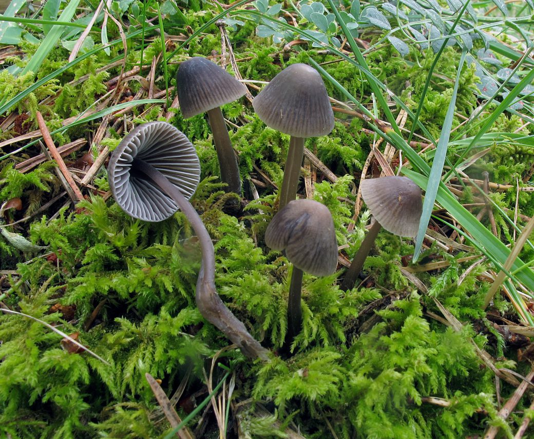 Descripción: Sombrero de 10 a 35 mm, campanulado a cónico y luego convexo, a menudo con pequeño umbo; superficie lisa, higrófana, gris pardo a grisácea, aclarando al secarse; margen translúcido-estriado en húmedo. Láminas adnatas a ligeramente decurrentes por diente, relativamente espaciadas, blanquecinas a gris pálido, con arista a menudo más clara. Pie de 30 a 90 mm por 1 a 3 mm, muy delgado, cilíndrico, hueco, grisáceo a pardo, a veces más oscuro hacia la base, con pruina fina en la parte superior; base con micelio blanco. Sin anillo ni volva. Carne muy escasa, olor fuerte a lejía o cloro al frotar, sabor poco marcado. Esporada blanca. Microscopia orientativa: esporas elipsoidales hialinas, lisas, amiloides en muchas micenas; presencia de queilocistidios característicos según sección.