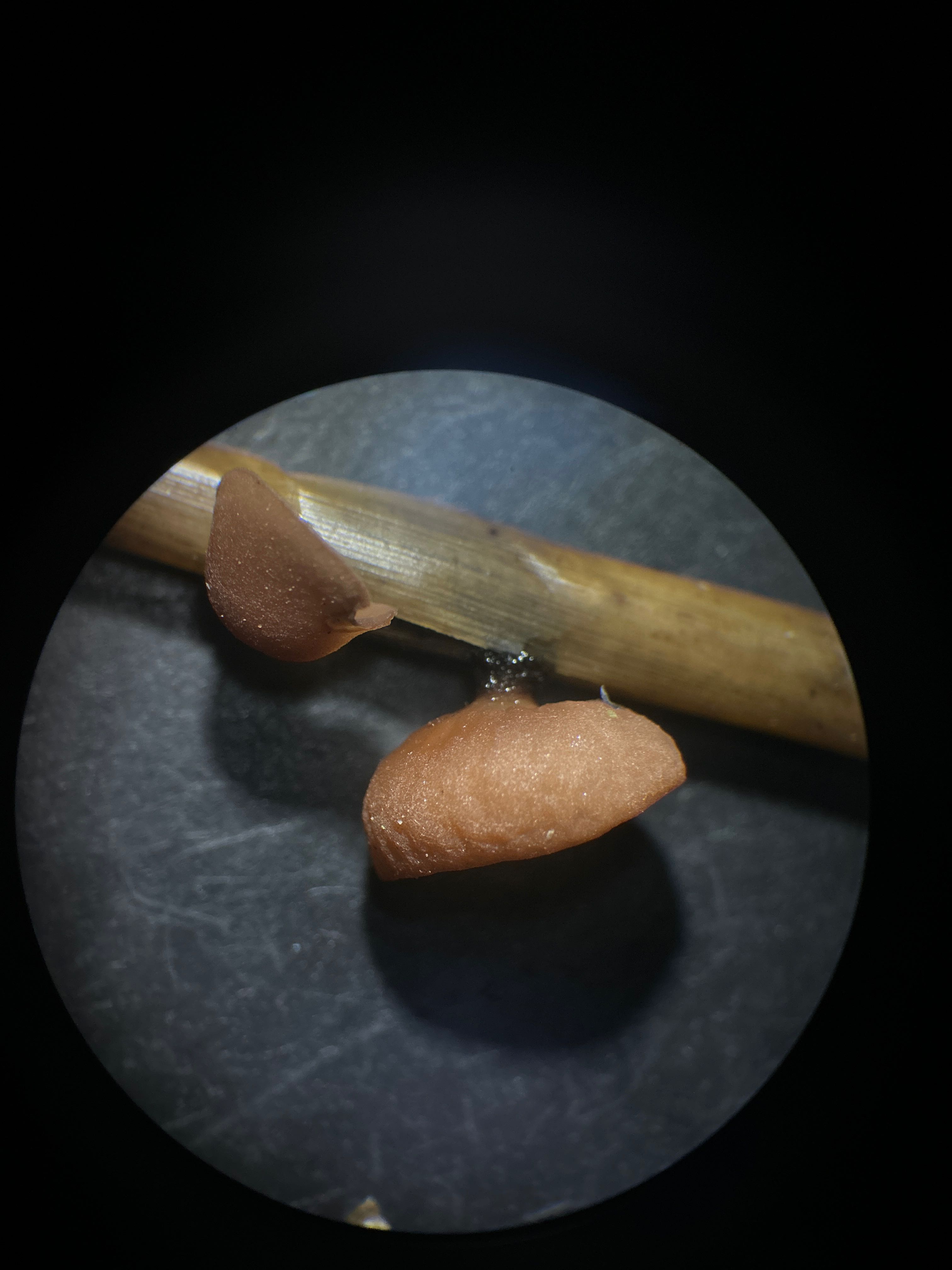 Descripción: Ascoma tipo apotecio, muy pequeño, discoidal a cupuliforme, de color pálido a ocráceo, sostenido por un pedicelo fino; aparece agrupado o disperso sobre el sustrato. Asociado a esclerocios negros, duros, subglobosos a irregulares, incrustados o adheridos a restos vegetales. No presenta sombrero, pie y láminas en el sentido de agaricales; el himenio es liso en la superficie del disco. Esporada blanca en masa. Microscopia orientativa: ascos con 8 esporas hialinas y elipsoidales; paráfisis presentes; caracteres finos necesarios para confirmar especie dentro del grupo.
