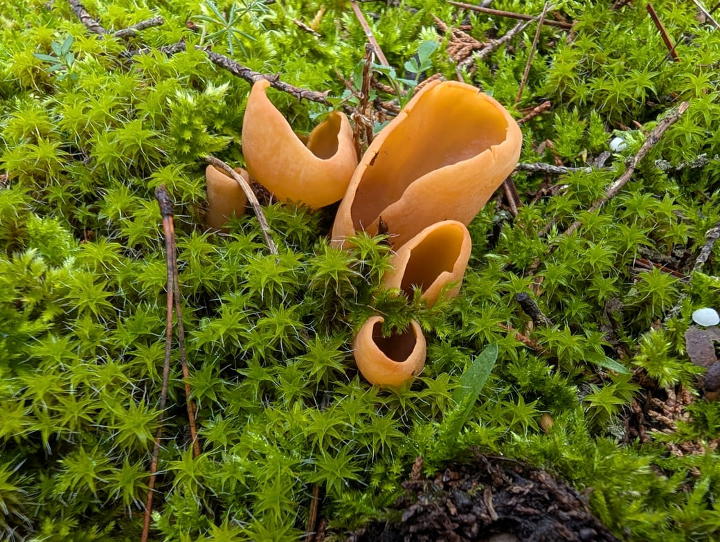 Forma apotecios relativamente grandes para un ascomiceto, de colores amarillos a anaranjados, con la cara interna fértil más viva y la externa más pálida. Suele aparecer en grupos, con numerosas «orejas» apiñadas, lo que la convierte en una seta muy llamativa cuando se observa de cerca el suelo del bosque.