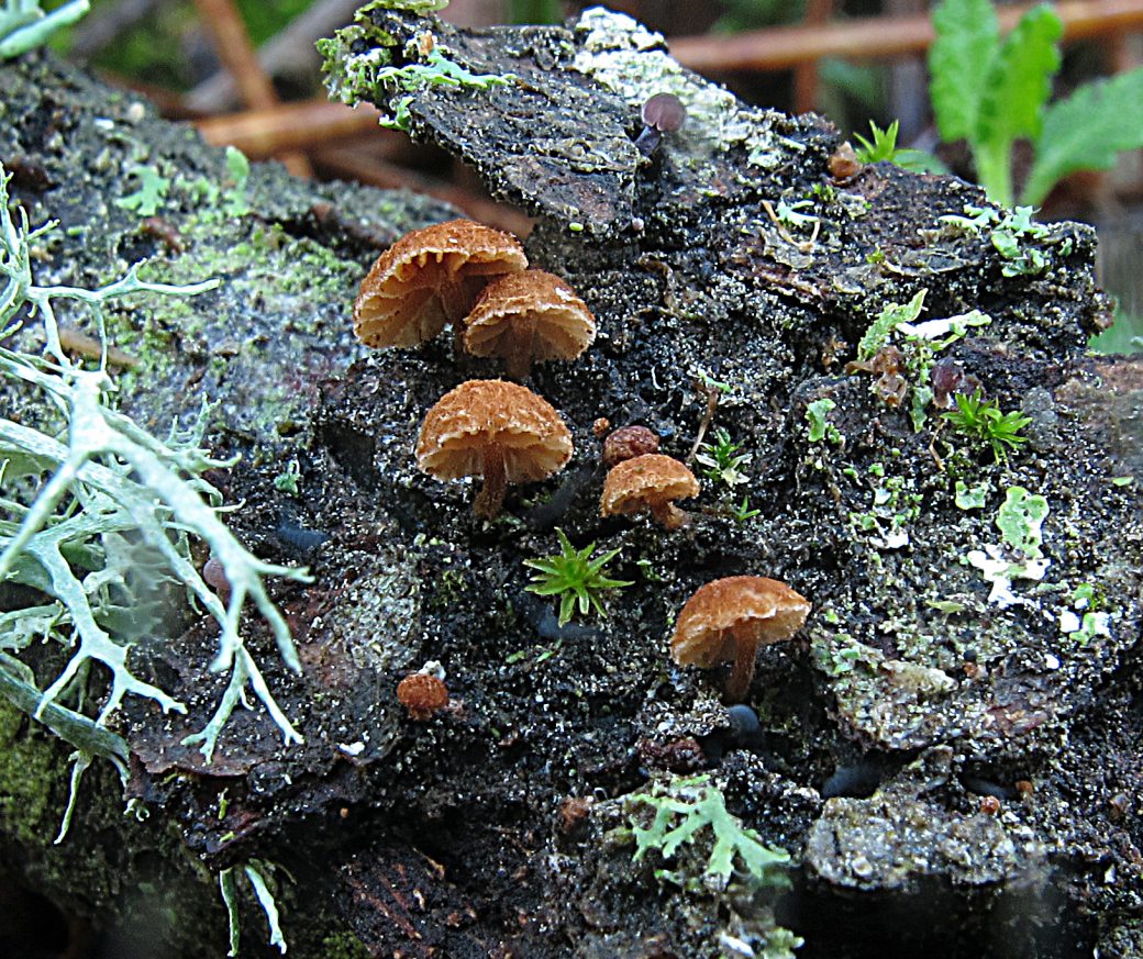 Descripción: Sombrero muy pequeño, aprox. 3-15 mm, hemisferico a convexo y luego algo extendido; superficie seca, finamente tomentosa o escamosa, de color ocre, ocre-anaranjado a pardo, a veces mas oscuro en el centro; margen fino, a menudo con pequeños flecos por el tomento. Laminas adnatas a adnexas, relativamente separadas, inicialmente ocraceas y luego pardo canela; arista mas clara. Pie 5-30 x 0,5-2 mm, delgado, cilindrico, ocraceo a pardo, con fibrillas; base insertada en grietas de corteza, con micelio escaso. Sin anillo ni volva. Carne muy escasa; olor débil. Esporada pardo tabaco; esporas elipsoidales a amigdaloides, lisas a finamente verrucosas segun observacion; cistidios presentes y caracteres de pileipelis propios del genero.