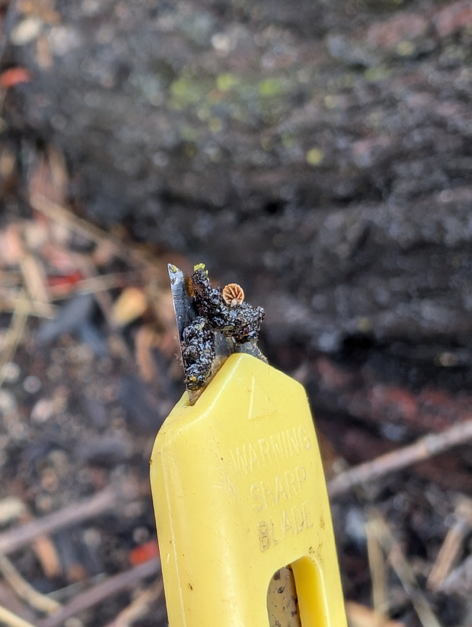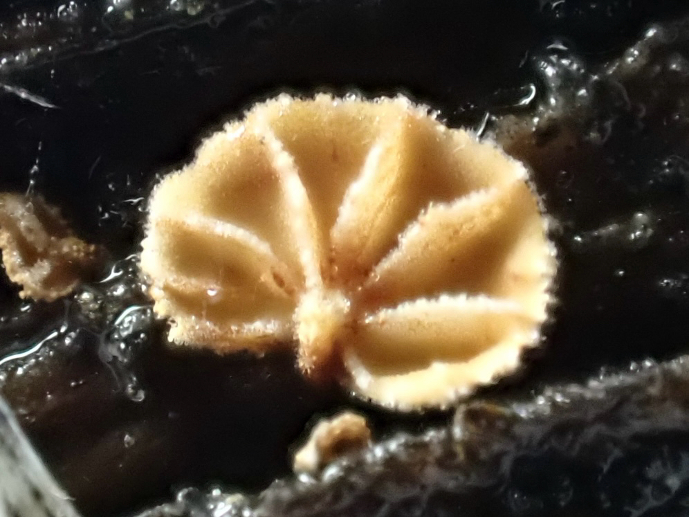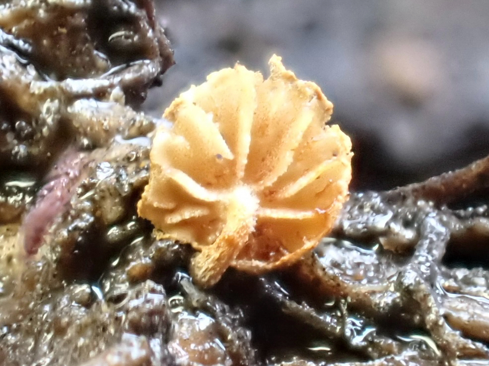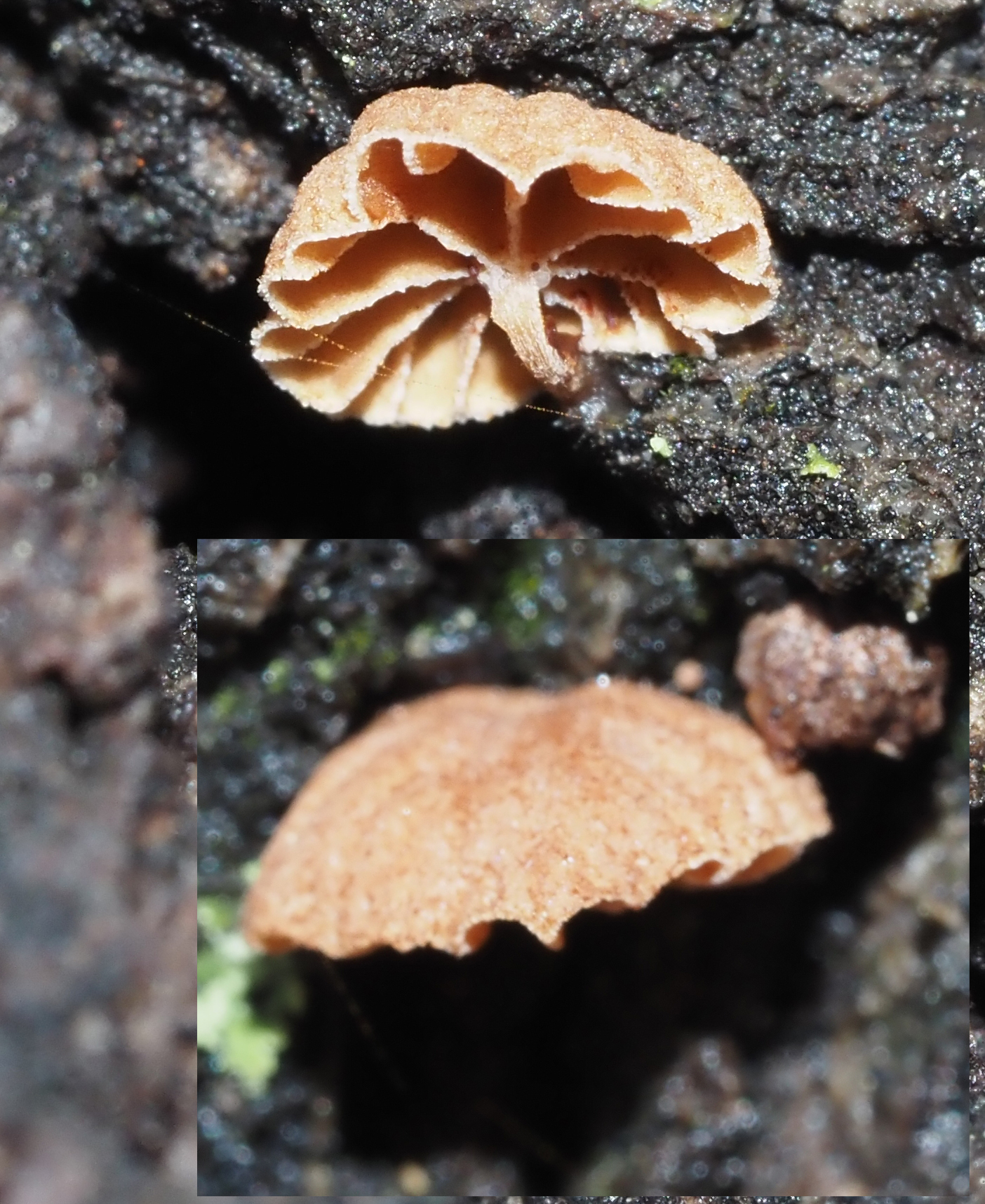 Examine ramas con corteza cuarteada y madera parcialmente descompuesta, usando lupa. Busque pequeños sombreros en las grietas, a menudo en grupitos. La fotografia macro con luz rasante ayuda a ver la textura del sombrero y la insercion de las laminas. Anote siempre el tipo de sustrato y si hay corteza resquebrajada.