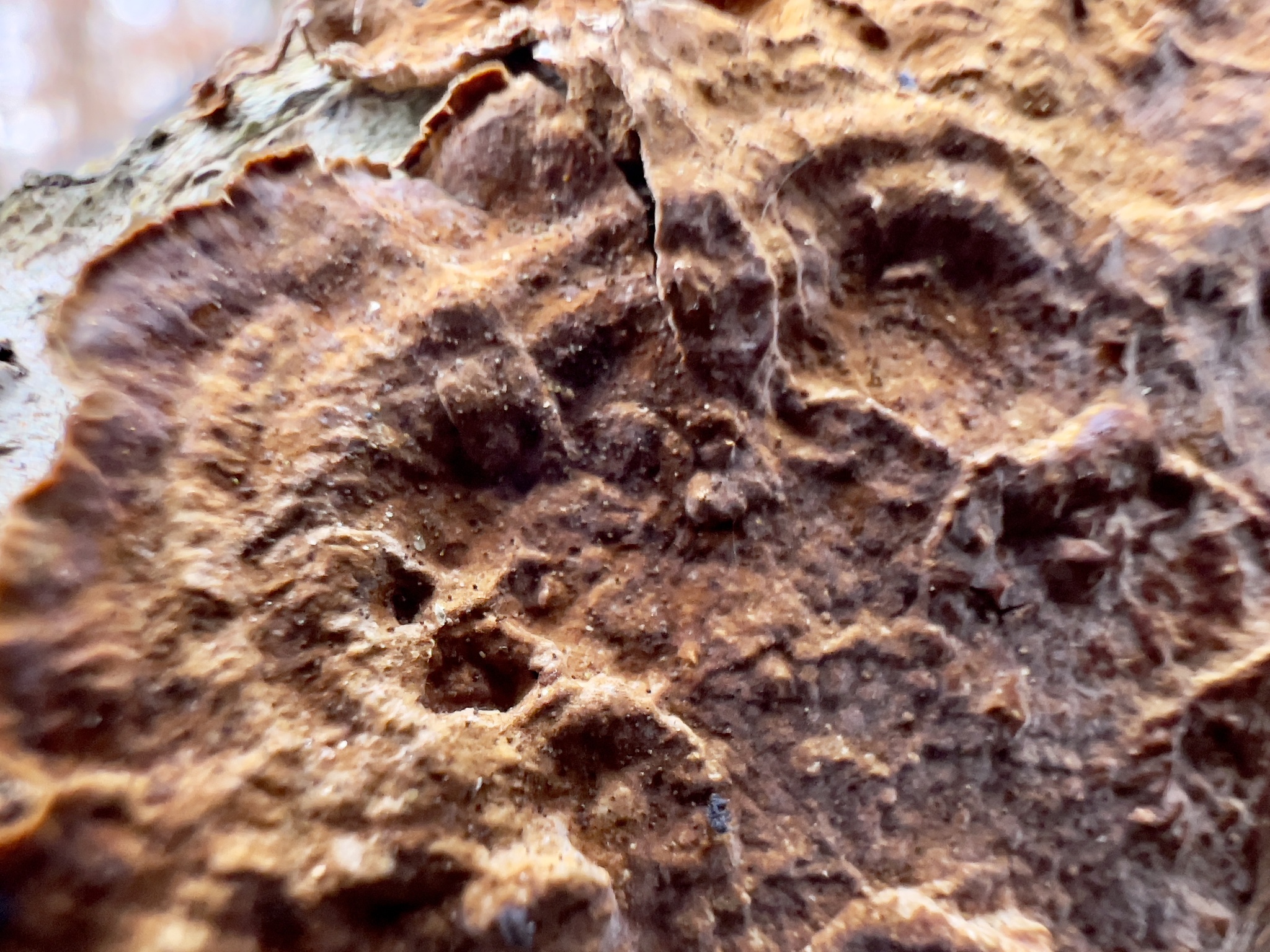 Descripción: Basidioma resupinado, formando parches extensos adheridos a la madera, de pocos milímetros de grosor. Superficie himenial lisa a finamente granulosa o puntuada, con zonación concéntrica visible en bandas de color pardo, ocre a pardo rojizo, a veces con transiciones más claras y oscuras; margen frecuentemente difuso, deshilachado y estrigoso (con fibrillas). Contexto delgado, tenaz, que puede secarse y rehidratarse. No presenta pie, anillo ni volva. Esporada clara. Microscopia orientativa: basidios y esporas hialinas, sistema hifal con hifas generativas con conexiones en abrazadera en muchas corticioides; caracteres de cistidios y estructura del himenio necesarios para confirmación a especie.