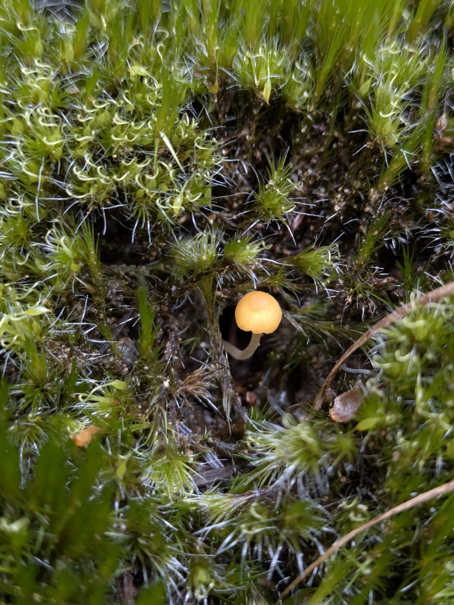 Método de identificación: 1) Localización: crecer directamente entre musgos en suelos húmedos, a menudo ácidos, en turberas o claros frescos. 2) Tamaño muy pequeño y color naranja intenso, visible como puntos en la alfombra de musgo. 3) Sombrero convexo a plano, a veces ligeramente deprimido, liso y higrófano. 4) Láminas separadas y algo decurrentes, no extremadamente apretadas. 5) Pie muy fino y frágil, de color similar, sin anillo ni volva. 6) Esporada blanca. 7) Diferenciales: separar de pequeñas especies de Galerina por esporada parda y hábitat distinto, y de omfalinoides anaranjados mayores por tamaño, láminas y asociación estricta a musgos. 8) Confirmación: microscopia con esporas hialinas lisas y caracteres de Rickenellaceae.