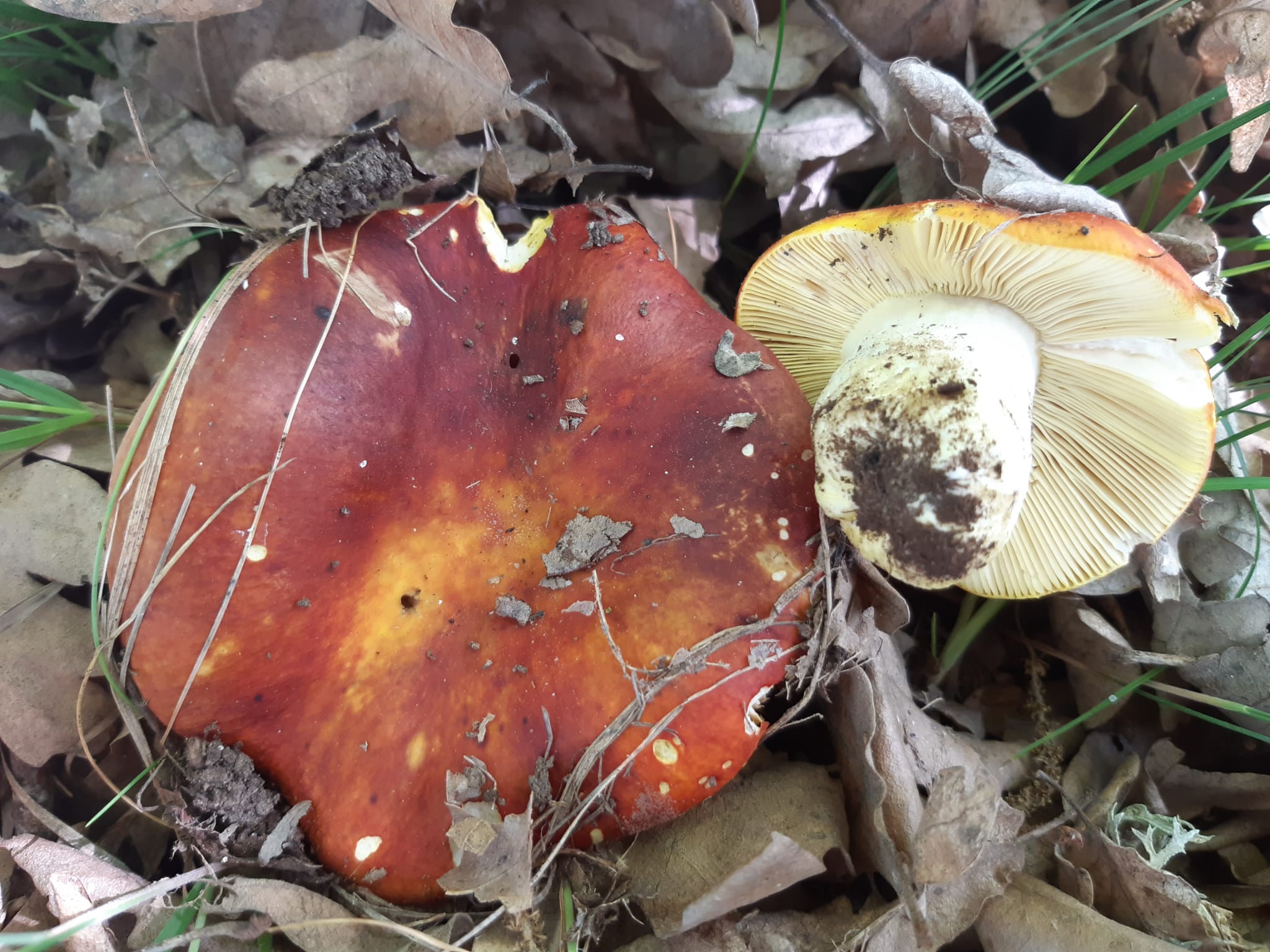 Confirmar conjunto de rasgos: sombrero rojo anaranjado con posibles zonas amarillas, láminas claramente amarillas y frágiles, pie amarillo sin anillo ni volva, carne quebradiza típica de Russula y esporada ocre amarillenta. Ecología: sobre suelo en frondosas, a menudo en suelos calizos. Diferenciales: rúsulas rojas con láminas blancas o crema no encajan; especies de sabor acre o picante suelen ser irritantes; Amanita caesarea tiene láminas amarillas pero presenta volva y anillo, por lo que se descarta rápidamente si se observa la base y el pie. Ante duda, no consumir.