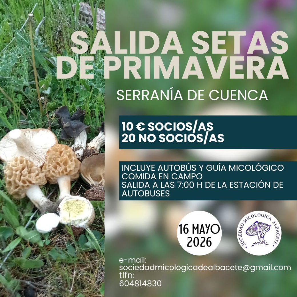 Según el cartel difundido por la Asociación Micológica de Albacete, la salida tendrá lugar el 16 de mayo de 2026 y está prevista la salida a las 7:00 h desde la estación de autobuses. El precio indicado es de 10 euros para socios y socias y de 20 euros para no socios y no socias.