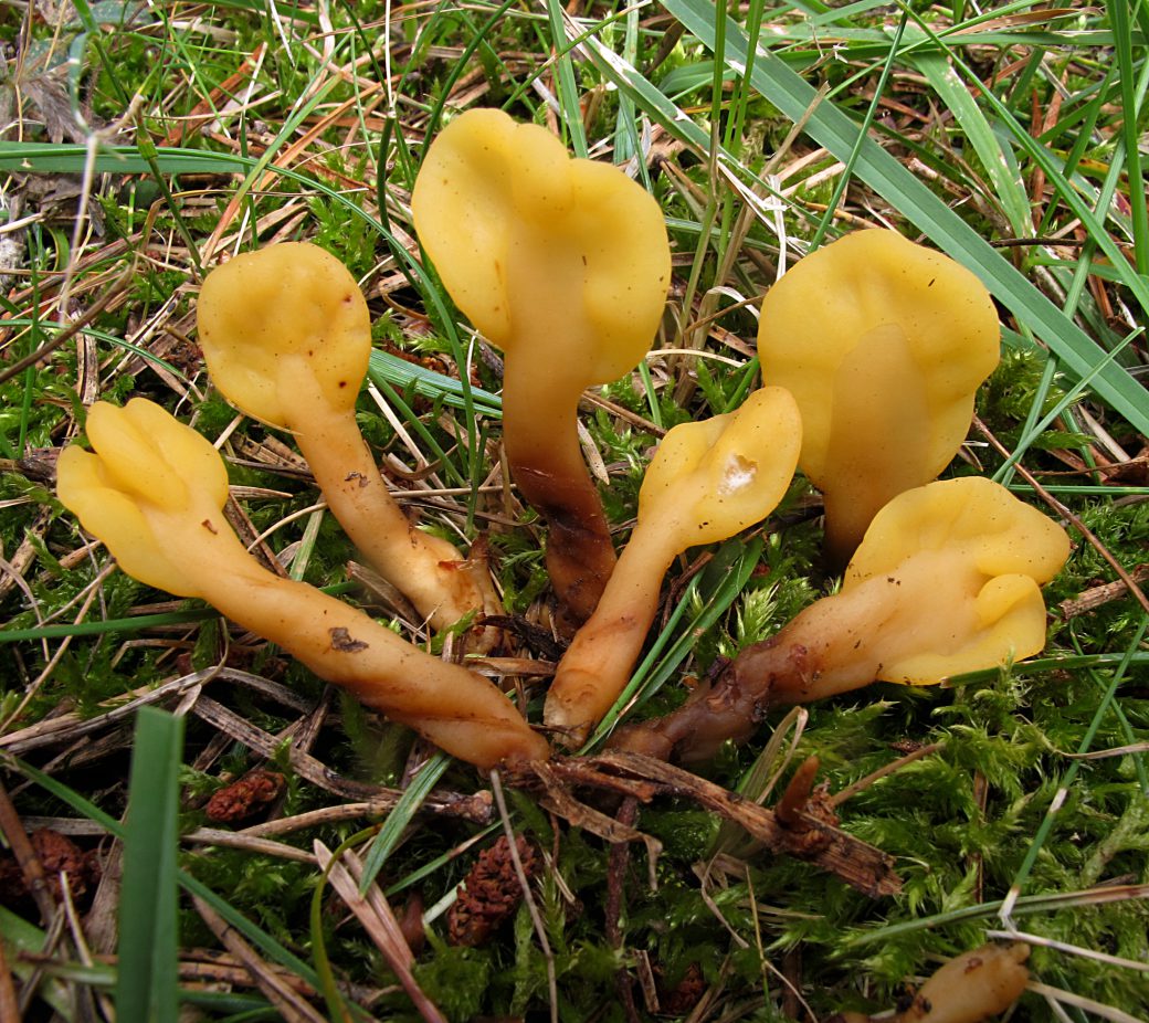 Camina despacio por pinares con musgo y acículas, mirando a ras de suelo. Sus cuerpos fructíferos destacan como pequeñas lenguas amarillentas emergiendo del musgo. Una lupa ayuda a apreciar la parte superior aplanada y la transición hacia el estípite. Suele aparecer dispersa o en pequeños grupos.