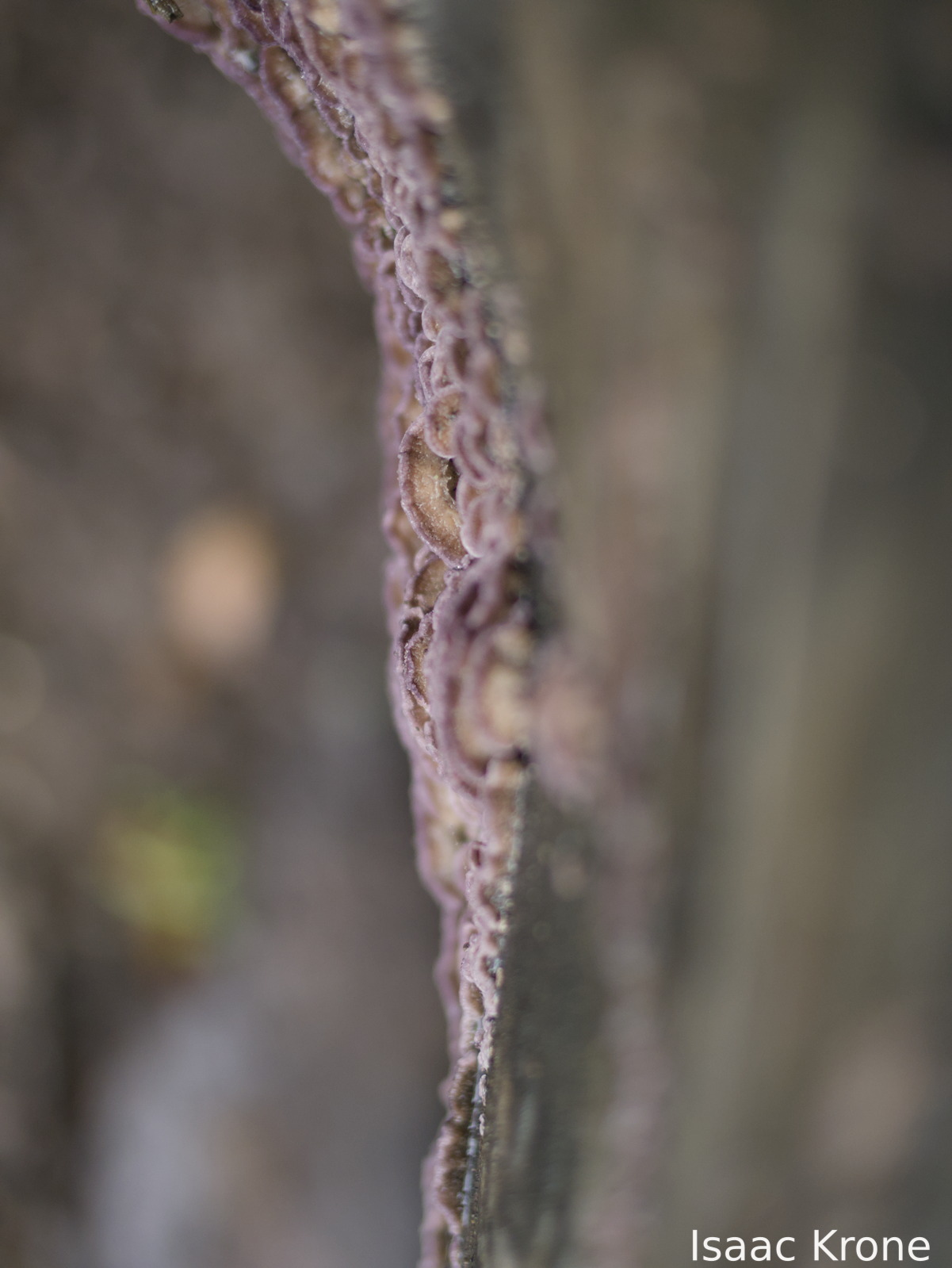 Descripción: Carpóforos sésiles en forma de repisa o abanico, de 1 a 6 cm de ancho, delgados, a menudo imbricados en grupos. Haz con zonas concéntricas (zonado) de pardo claro a gris pardo, a veces con matices violáceos cerca del margen en ejemplares frescos; superficie tomentosa a finamente vellosa, mate. Margen fino, blanquecino a crema, en ocasiones violáceo en crecimiento activo. Himenio en el envés inicialmente violeta a púrpura, volviéndose gris pardo o pardo con la edad; poros de 1 a 3 por mm, irregulares, a menudo alargados y con tendencia a desgarrarse formando bordes dentados o aspecto hidnoide. Tubos cortos, concoloros. Carne coriácea, delgada, blanquecina a pardo pálido; olor suave. Esporada blanca. Microscopia orientativa: sistema hifal dimítico con hifas esqueléticas; presencia de cistidios o setas características del género según autores.